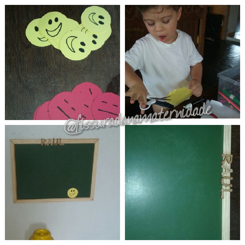 Então vou mostrar como fiz o quadro aqui em casa. Peguei um quadro negro que Raul já tinha e cortei círculos vermelhos e amarelos e fiz carinhas com expressão de triste e feliz respectivamente. Bem simples e barato! Na internet você acha vários modelos para imprimir e copiar. Tem também em lojas de artesanatos que você pode comprá-los prontos ou encomendar da forma que você queira. Como o meu objetivo era único, fiz dessa forma por ser mais simples para ele entender.