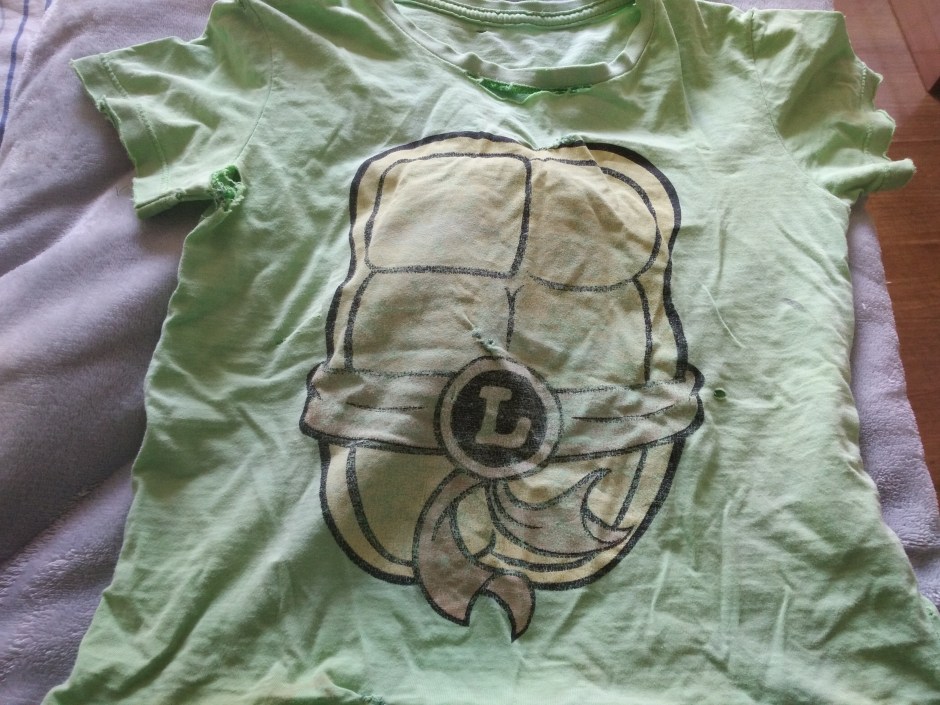 A blusa foi comprada para ele usar no seu aniversário de 3 anos, não era uma simples blusa… ela tinha um casco atrás como se fosse o casco verdadeiro da Tartaruga o que fazia o Raul se sentir o verdadeiro Leonardo, a Tartaruga Ninja preferida dele. Ele usava essa blusa para tudo, sair, dormir, segurar… a levava para todos os lugares e eu tinha que lavá-la todos os dias, sim eu disse TODOS os dias porque ele me deixava louca perguntando cadê a blusa se eu não o deixasse usá-la. Quando ela estava lavando era como se eu tivesse pegado uma coisa MUITO importante dele, a blusa era como se fizesse parte do corpo dele… já estava virando novela quando tentei comprar outra, mas para a minha infelicidade eu não achei em lugar algum. Compramos outras fantasias da Tartaruga Ninja e outras blusas também delas, mas nenhuma substituía aquela blusa do Leonardo de casco atrás. Para vocês terem uma ideia viajamos para a praia e ele usou a blusa os cinco dias que ficamos lá sem lavá-la. Só não usou no último dia porque ela caiu no mar e depois na areia… Vocês podem pensar: Nossa que porqueira… Mas, eu deixei… ou era isso ou deixava meu filho extremamente triste. Quando percebi que aquilo não estava “normal”, que essa fixação pela blusa não era um simples capricho, comecei a pesquisar e foi aí que resolvi escrever o texto sobre Objeto de Transição. Descobri que algumas crianças aderem algum objeto para acompanhar a transição delas de uma fase para outra de sua vida. Foi assim com o Raul, a blusa que era verde vivo virou um verde desbotado quase amarelo, cheia de furos, o casco já não existia mais há um bom tempo. Os furos foram sendo costurados ao longo do tempo, mas chegou um momento que não dava mais, o pano já estava tão fino que se puxasse rasgava com facilidade. Estava com vergonha de vê-lo usando a blusa. Quando ele cismava em sair vestido com a blusa as pessoas reparavam e certa vez me peguei explicando para uma moça em uma fila do caixa da farmácia o porquê da blusa estar toda rasgada e o meu filho vestido com ela.